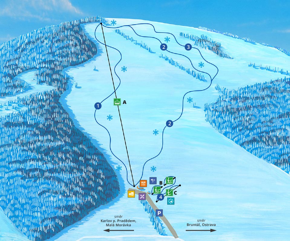 Z samochodu prosto na stok . Można nas znaleźć w Górnym Václavově, zaledwie kilka minut jazdy od górskich wiosek Karlov pod Pradědem, Malá Moravka lub Dolní Moravice w Jesionikach. Profil i szerokość torów jest idealny dla początkujących i miłośników szerokich łuków i snowboardzie. Czeka na ciebie tutaj wygodna kolejka linowa, wielki park dla dzieci, bistro i bezpłatny parking, bezpośredne u stoku
